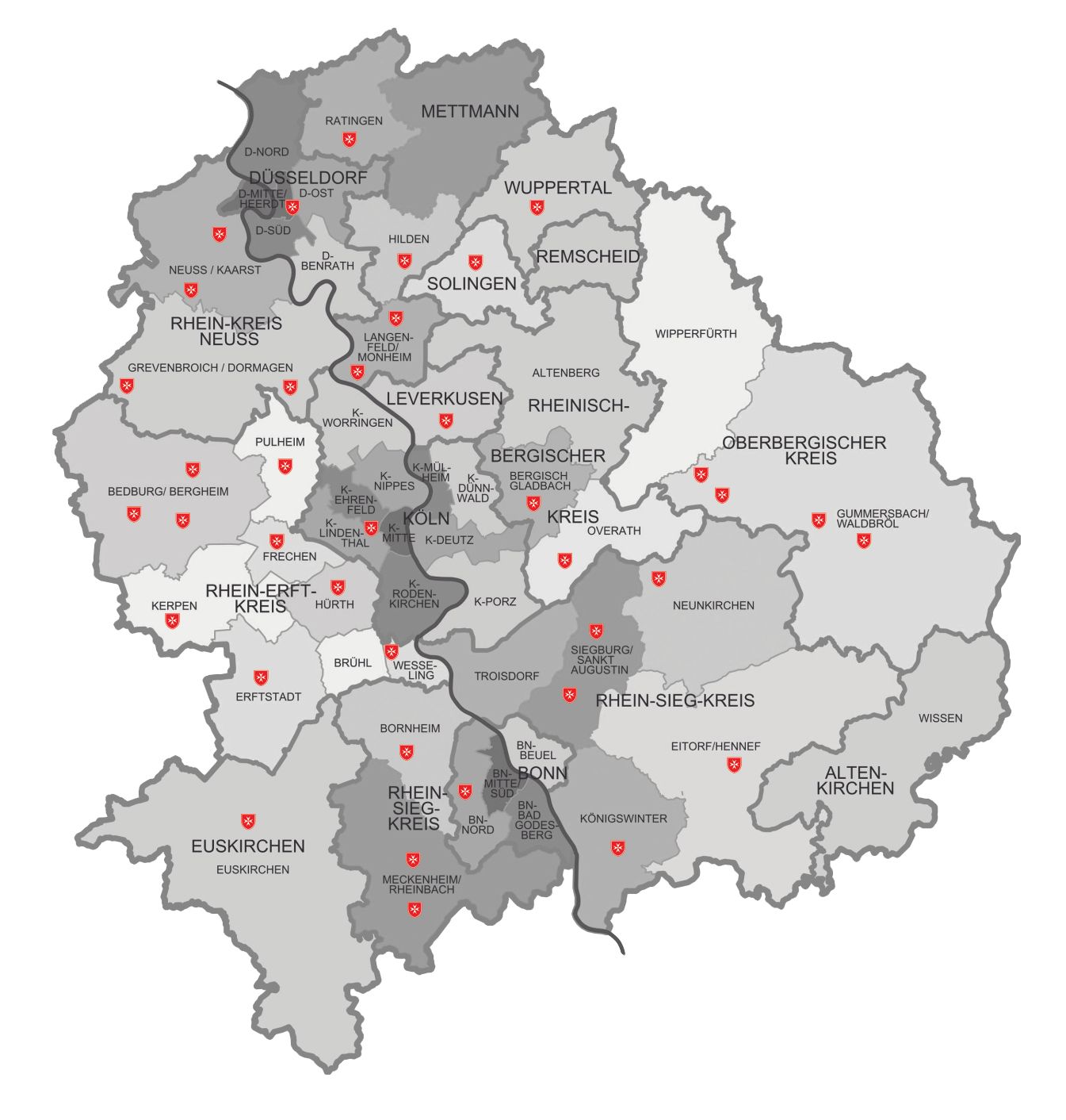 Regierungsbezirk Düsseldorf: Düsseldorf, Duisburg, Essen, Kleve, Krefeld, Mettmann, Mönchengladbach, Mülheim, Neuss, Oberhausen, Remscheid, Solingen, Viersen, Wesel, Wuppertal.